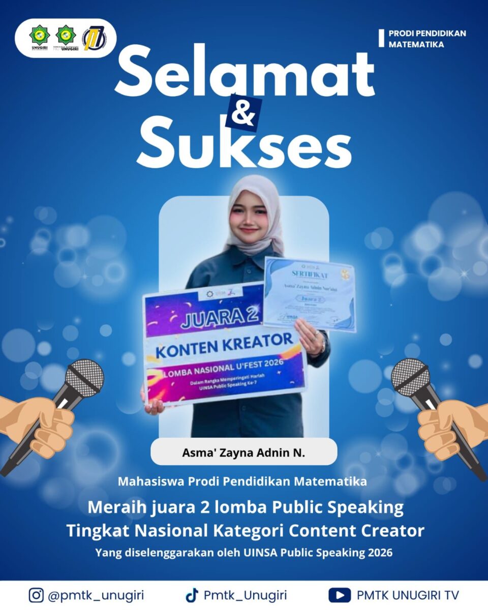 pmtk.unugiri.ac.id – Program Studi Pendidikan Matematika Universitas Nahdlatul Ulama Sunan Giri (UNUGIRI) kembali menorehkan prestasi membanggakan di tingkat nasional. Mahasiswa atas nama Asma’ Zayna Adnin Nuraini […]