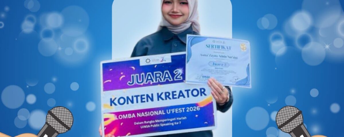 April 2, 2026pmtk.unugiri.ac.id – Program Studi Pendidikan Matematika Universitas Nahdlatul Ulama Sunan Giri (UNUGIRI) kembali menorehkan prestasi membanggakan di tingkat nasional. Mahasiswa atas nama Asma’ Zayna Adnin Nuraini yang akrab disapa Zayna. berhasil meraih Juara 2 dalam kategori Content Creator pada ajang Lomba Nasional U’FEST 2026. Kompetisi bergengsi ini diselenggarakan oleh UINSA Public Speaking dalam rangka memperingati Harlah UINSA Public Speaking yang ke-7.